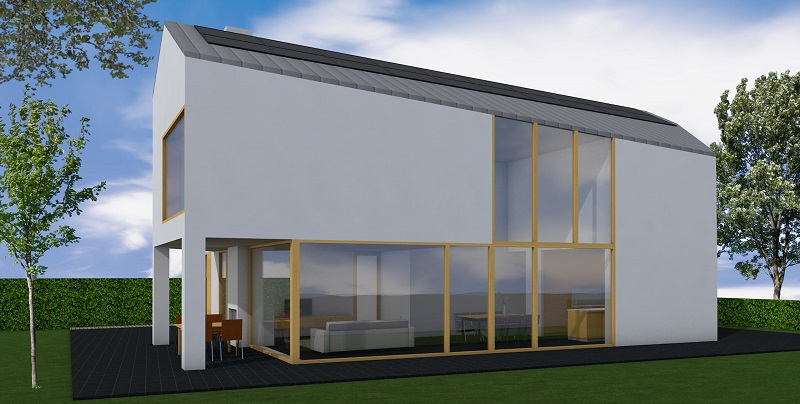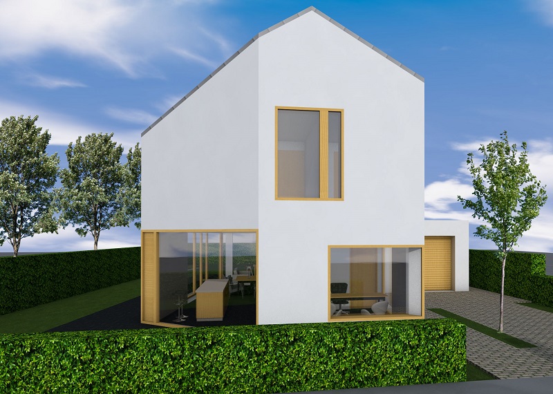 voor een eigentijds woonhuis zonder gasaansluiting. De hoekkavel in de uitbreidingswijk Stadshagen te Zwolle is bijzonder mooi gelegen. Een park aan de voorzijde, een groenstrook met water aan de zuidzijde en een grote privé tuin aan de westzijde. De vorm van het huis reageert op de hoekverdraaiing van de zij erfgrens. Hierdoor ontstaat een markante dakvorm. Het ontwerp is voorzien van een warmtepomp, lage temperatuurverwarming, zonnepanelen, hoge isolatiewaarden, trippel beglazing, warmteterugwinning uit de ventilatielucht en zomernacht koeling. De woning wordt niet aangesloten op het gasnet. |