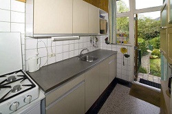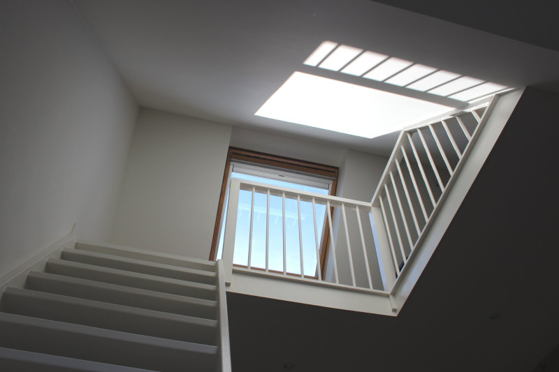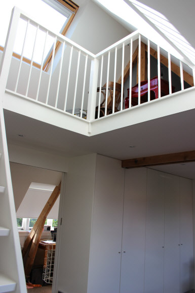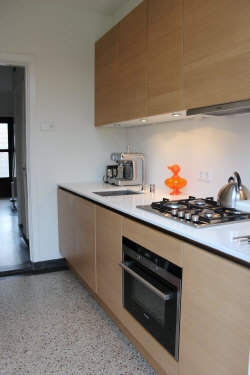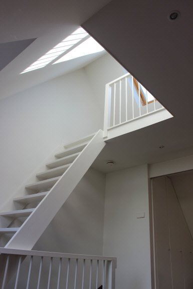 In de kap van de jaren ‘50 rijwoning was zoveel hoogte aanwezig dat een vliering mogelijk werd. De bestaande open ruimte van de zolder is getransformeerd in een slaap, werk en bergzolder waarbij de openheid behouden is gebleven. de werkruimte is middels een schuifdeur af te sluiten. De keuken en badkamer vernieuwd. De materialisering en kleurstelling is afgestemd op de granitovloer van de woning. Tegelijkertijd is de woning geheel verduurzaamd met behoud van originele detail. |