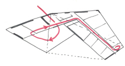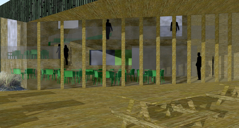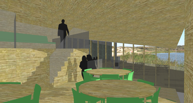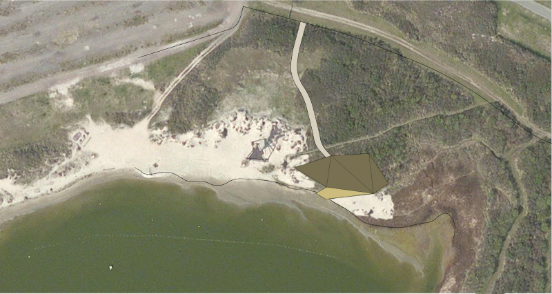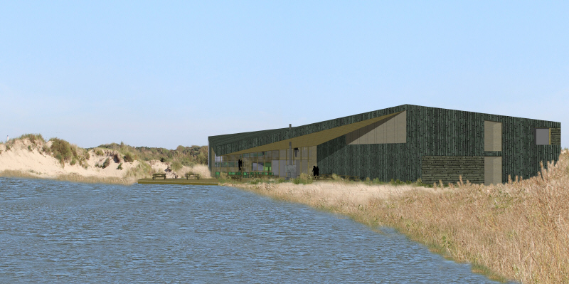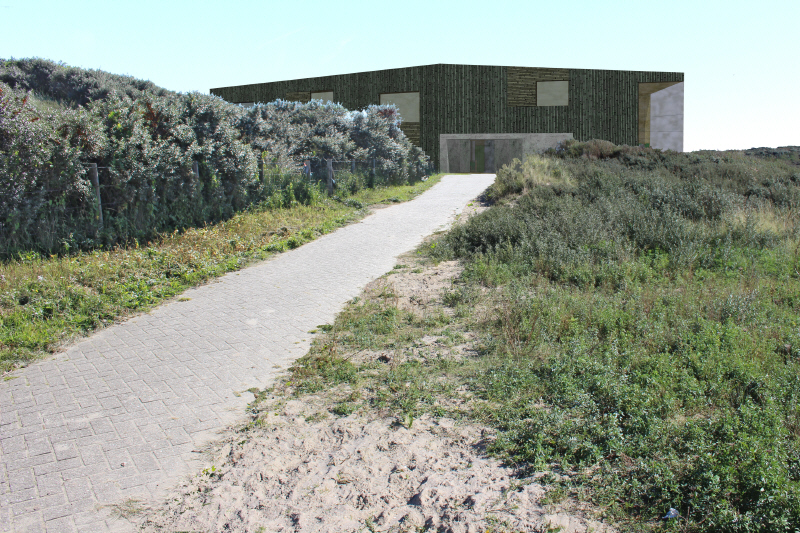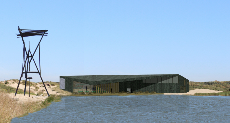Het concept voor het paviljoen is geïnspireerd op de vleugel van de aalscholver. De vleugel ligt op het strand en kadert het uitzicht in de richting van het meer en de duinen. De structuur van de veren komt terug in de bekleding van de gevels en het dak. Het paviljoen ligt op de grens van de duinen en het strand van het duinmeer. Na het passeren van de entree opent het gebouw zich wijds. De unieke plek aan het meer is zowel vanuit de gemeenschappelijke ruimte binnen, als vanaf het grote overdekte terras buiten goed te ervaren. De route binnen in het paviljoen kun je opvatten als een duinwandeling. Het is een aaneenschakeling van intieme doch open ruimtes en biedt uitzichten vanaf verschillende split-level niveaus. De materialen en kleuren van het exterieur en interieur hebben een natuurlijk karakter. Het resultaat is een zeer energie-zuinig gebouw met een natuurlijke uitstraling en een minimale ecologische ‘footprint’. Waar de gemeenschappelijke ruimte zich oriënteert op het meer, zijn de slaapvertrekken georiënteerd op de duinen met daarop de bunkers van de Atlantic wall. Het paviljoen staat heel direct in het landschap. De duinen en het strand lopen tot aan de gevels van het gebouw. Ook de driehoeksvormen van de klimtoren komen in het nieuwe paviljoen terug. Het is een verrassend gebouw zonder te willen imponeren. Het paviljoen biedt ruimte aan 150 - 200 personen voor het dagprogramma, daarnaast is er slaapruimte voor 50 personen. Ontwerp 2015, niet uitgevoerd. |