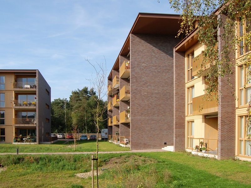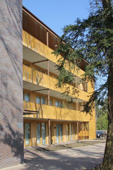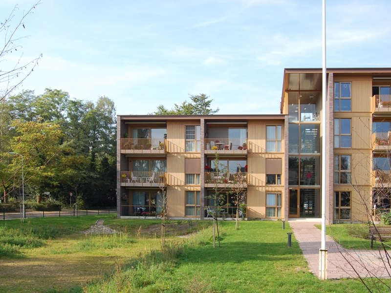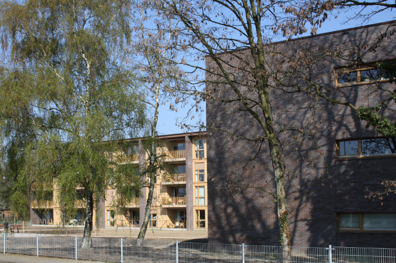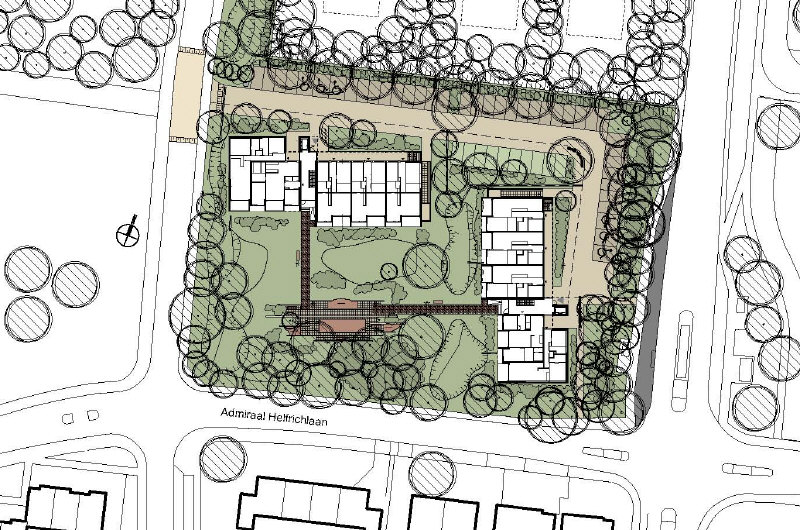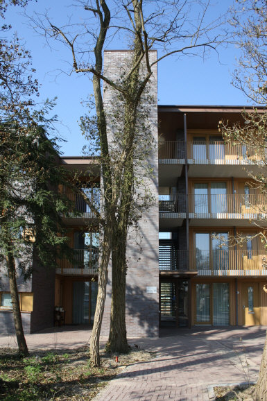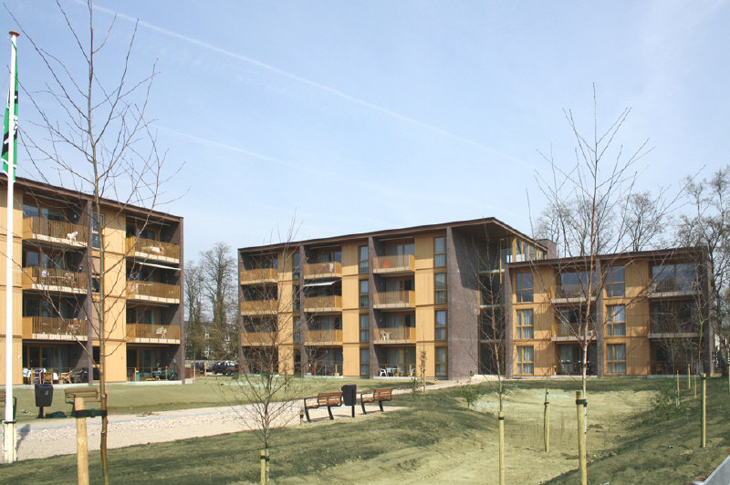 De nieuwbouw is gesitueerd op een groene plek aan de Harderwijkerweg op de overgang tussen gesloten bebouwing en een meer open bebouwing in de groene uitlopers van de Veluwe. In verschillende bijeenkomsten met de bewoners is nagedacht over het wonen in het groen. Naar aanleiding hiervan is in samenwerking met SAB een stedenbouwkundig plan opgezet. Deze bebouwingsenveloppe, twee haaks op elkaar staande gebouwen, met ieder 18 appartementen in 3 en 4 bouwlagen is vervolgens met de omwonenden en gemeente vastgesteld. Ik heb me ingezet voor een grote centrale groene ruimte. Een plek voor de nieuwe bewoners maar zeker ook voor de buurt. De invulling van deze groenen zone, de terreininrichting, heb ik verzorgd. Het parkeren is grotendeels aan het zicht onttrokken door dit achter de bebouwing te situeren. De appartementen maken deel uit van de woonservice zone rondom het zorgcentrum Beverode. De nieuwbouw kan qua schaal en bebouwingshoogtes worden gezien als intermediair tussen de omliggende woonbebouwing en het grote naastgelegen zorgcentrum. De gebouwen zijn geleed in volumes met 3- en 4 bouwlagen, die ten opzichte van elkaar zijn verschoven. In de tussenruimte bevindt zich de hoofdontsluiting. De entrees, gelegen aan de achterzijde van de bebouwing, worden gemarkeerd door de liftschachten. |