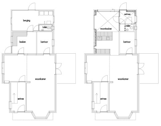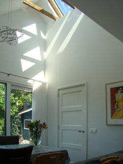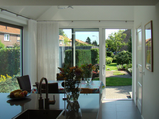 De plattegrond van de woning was een verzameling vertrekken zonder ruimtelijke relatie. Tussen de woonkamer aan de voorzijde en de achtertuin bevond zich in het achterhuis een barrière van wanden en deuren. De meanderende route door de keuken en berging, eindigend op een gesloten achtergevel. De opgave is vertaald naar: het maken van een ruimtelijke samenhang tussen woonkamer, woonkeuken en tuin. Door gevels en tussenwand van het achterhuis open te breken en de doorgang tussen de woonkamer en keuken te verplaatsen zijn de ruimtes onderling en met de achtertuin verbonden. De ruimtebeleving wordt versterkt door de extra hoogte en het licht van boven in het achterhuis. Vanuit de woonkamer gezien 'lost' de ruimte zich naar buiten toe op. Aanleiding voor deze ingreep was de geringe plafondhoogte en het gemis van zonlicht voor een groot deel van de dag. De vide bood de mogelijkheid een daklicht op de nok te plaatsen. De bestaande sporen en hanenbalken, die in het zicht gelaten zijn, bepalen de afmetingen van het daklicht. De oude houtconstructie en het zonlicht zorgen samen voor een door de dag en seizoenen veranderend licht- en schaduwspel. De nieuwe openingen in de gevels zijn fors van formaat. De eenvoudige en eigentijdse vormgeving zoekt aansluiting bij de sobere detaillering van het achterhuis. |
