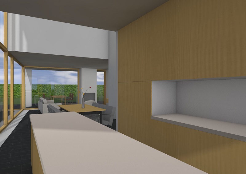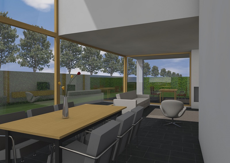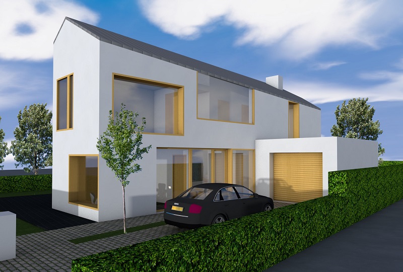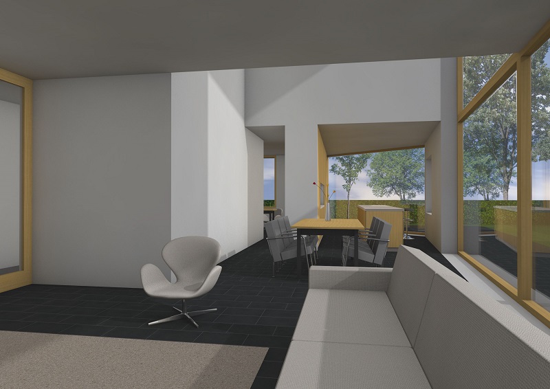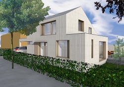 voor een eigentijds woonhuis zonder gasaansluiting. De hoekkavel in de uitbreidingswijk Stadshagen te Zwolle is bijzonder mooi gelegen. Een park aan de voorzijde, een groenstrook met water aan de zuidzijde en een grote privé tuin aan de westzijde. De vorm van het huis reageert op de hoekverdraaiing van de zij erfgrens. Hierdoor ontstaat een markante dakvorm. Het ontwerp is voorzien van een warmtepomp, lage temperatuurverwarming, zonnepanelen, hoge isolatiewaarden, trippel beglazing, warmteterugwinning uit de ventilatielucht en zomernacht koeling. De woning wordt niet aangesloten op het gasnet. |